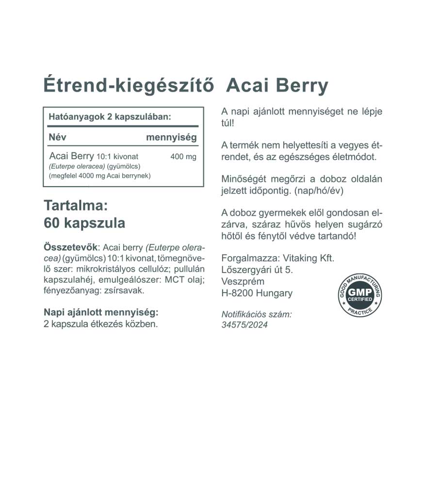 Összetevők: Acai berry (Euterpe oleracea) (gyümölcs) 10:1 kivonat, tömegnövelő szer: mikrokristályos cellulóz; pullulán kapszulahéj, emulgeálószer: MCT olaj; fényezőanyag: zsírsavak