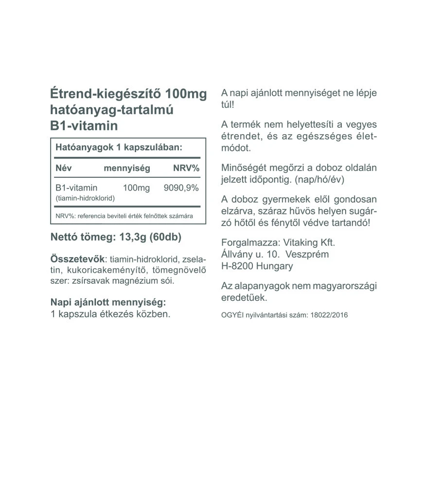 A Vitaking 100mg-os B1-Vitamin készítmény 60 kapszulás kiszerelelésben. Tanulás és fokozott szellemi terhelés esetén ajánlott a fogyasztása. A tiamin (B1-vitaminnak is nevezik) vízben oldódik, naponta pótolni kell, akárcsak a többi B-vitamin komplexhez tartozó vitaminokat. A B1-vitamint erkölcsi (morális) vitaminnak is nevezik, az idegrendszerre és a szellemi viselkedésmódra gyakorolt hatása miatt. A B1 vitamin részt vesz a normál energiatermelő anyagcsere-folyamatokban, hozzájárul az ideg­rendszer normál működésé­hez, a normál pszichológiai funkció fenntartásához és a szív megfelelő működéséhez is.