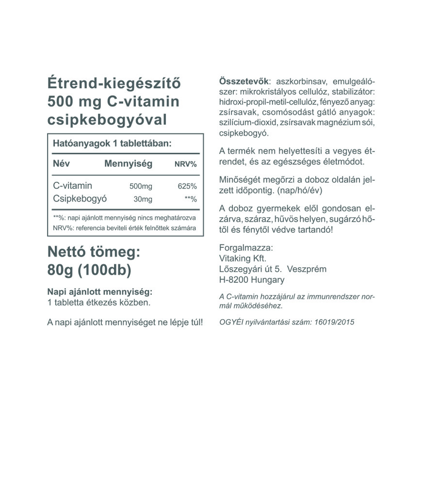 Ez a Vitaking termék 500 mg C-vitamin és 30 mg csipkebogyó kombinációja. A C-vitamin egyike a legnépszerűbb és leggyakrabban szedett vitaminoknak. A csipkebogyó jelentős C-vitamin forrás, emellett más vitaminokat, flavonoidokat tartalmaz. A C-vitamin hozzájárul az immunrendszer normál működéséhez, a normál energiatermelő anyagcsere-folyamatokhoz, az idegrendszer normál műkö­déséhez a sejtek oxidatív stresszel szembeni védelméhez a fáradtság csök­kentéséhez és okozza a vas felszívódását.