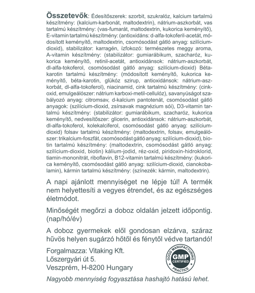 Édesítőszerek: szorbit, szukralóz, kalcium tartalmú készítmény: (kalcium-karbonát, maltodextrin), nátrium-aszkorbát, vas tartalmú készítmény: (vas-fumarát, kukorica keményítő, maltodextrin), E-vitamin tartalmú készítmény: (antioxidáns: d-alfa-tokoferil-acetát, módosított keményítő, maltodextrin, csomósodást gátló anyag: szilícium-dioxid), stabilizátor:karragén, ízfokozó: természetes meggy aroma, A-vitamin készítmény: retinil-acetát, kukorica keményítő, stabilizátor: gumiarábikum, szacharóz, antioxidánsok: nátrium-aszkorbát, dl-alfa-tokoferol, csomósodást gátló anyag: szilícium-dioxid) Béta-karotin tartalmú készítmény: béta-karotin, módosított keményítő, kukorica keményítő, glükóz szirup, antioxidánsok: nátrium-aszkorbát, dl-alfa-tokoferol), niacinamid, cink tartalmú készítmény: (cink-oxid, emulgeálószer: nátrium karboxi-metil-cellulóz), savanyúságot szabályozó anyag: citromsav, d-kalcium pantotenát, csomósodást gátló anyagok: (szilícium-dioxid, zsírsavak magnézium sói), D3-vitamin tartalmú készítmény: (kolekalciferol, antioxidáns: nátrium-aszkorbát, stabilizátor: gumiarábikum, szacharóz, kukorica keményítő, nedvesítőszer: glicerin, antioxidáns: dl-alfa-tokoferol, csomósodást gátló anyag: szilícium-dioxid) folsav tartalmú készítmény: folsav, maltodextrin, emulgeálószer: trikalcium-foszfát, csomósodást gátló anyag: szilícium-dioxid), biotin tartalmú készítmény: biotin, maltodextrin, csomósodást gátló anyag: szilícium-dioxid) kálium-jodid, réz-oxid, piridoxin-hidroklorid, tiamin-mononitrát, riboflavin, B12-vitamin tartalmú készítmény: (cianokobalamin, kukorica keményítő, csomósodást gátló anyag: szilícium-dioxid), kármin tartalmú készítmény: színezék: kármin, maltodextrin)