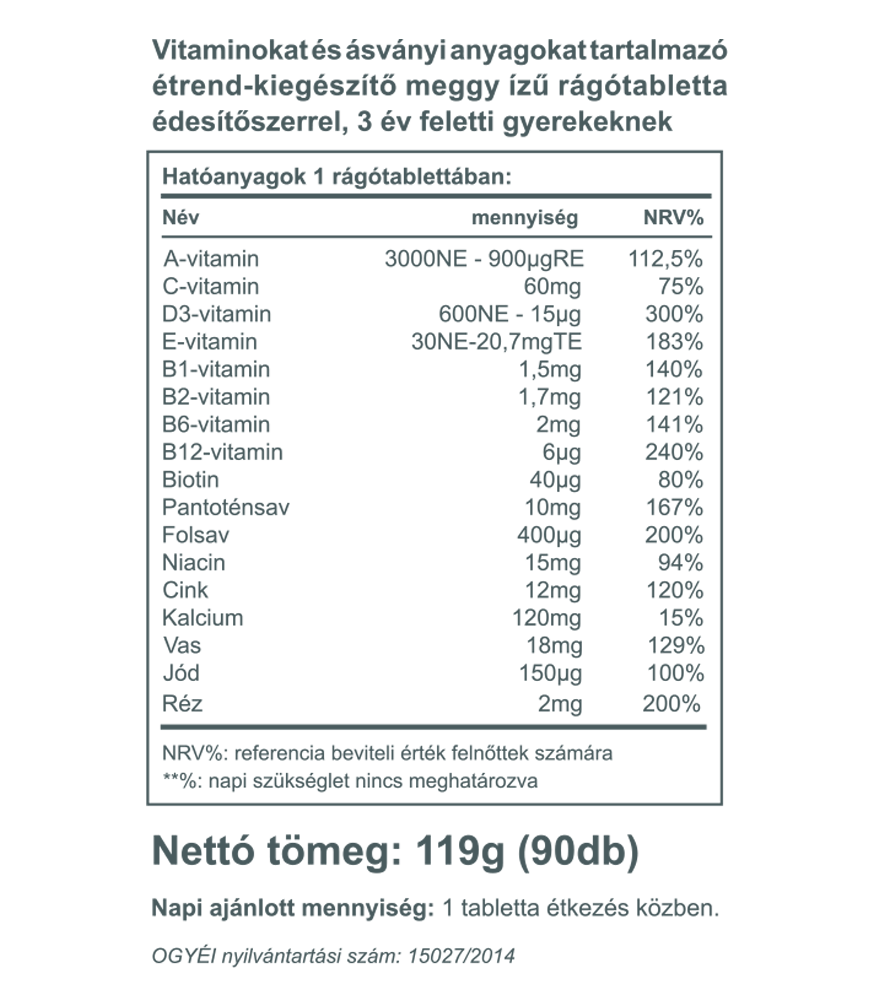Gyerek multivitamin hatóanyagok 1 tablettában  Mennyiség NRV%
