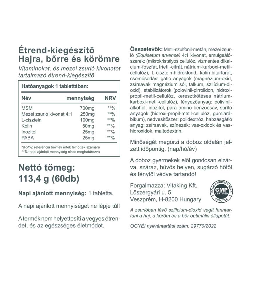 Tartalmaz többek között B-10 vitamint, vagy más néven Paba-t, kolint, inozitolt, l-cysteint, mezei zsurlót és MSM-et is.