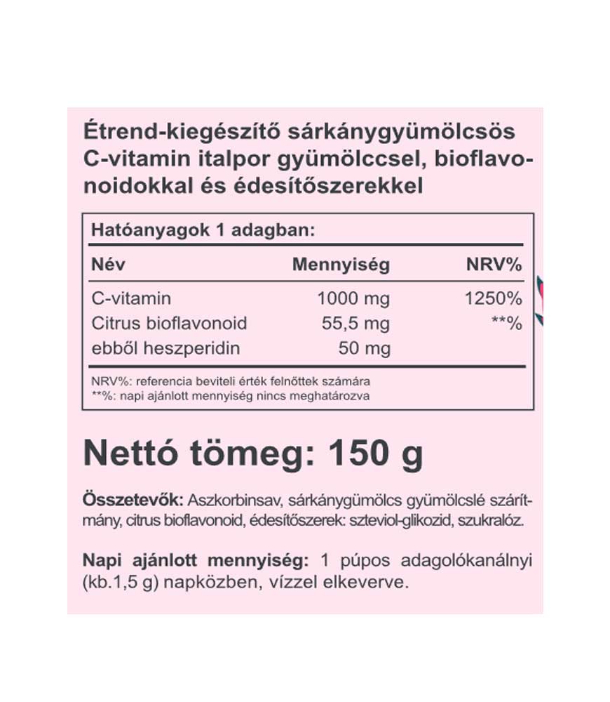Szereted az egzotikus ízeket? Frissülj fel minden nap egy természetes sárkánygyümölcs ízű C vitamin por alapú itallal. Add meg gyorsan és könnyedén a szervezeted számára szükséges c-vitaminadagot, miközben az ízlelőbimbóidat is kényezteted. 1 napi adag 1000mg C-vitamint + 55,5 mg citrus bioflavonoidot tartalmaz (melyből heszperidin 50mg) Ízesítés: sárkánygyümölcs gyümölcslé szárítmány, szteviol-glikozid, szukralóz.