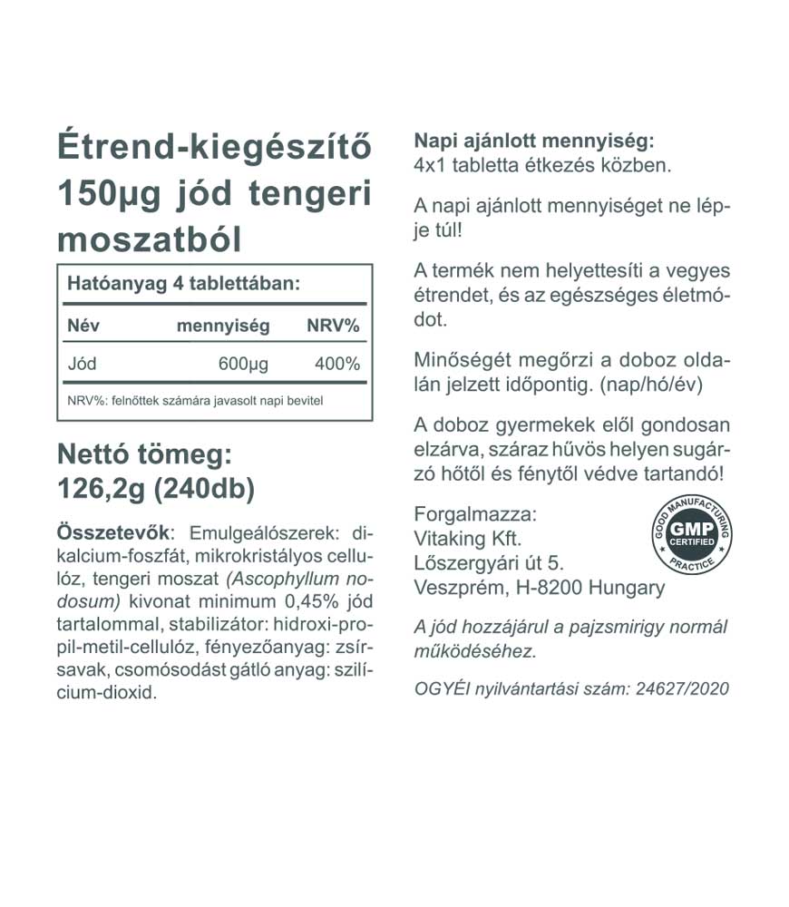 A tengeri moszat kiváló forrása a természetes jódnak. A Vitaking Jód tabletta napi adagja (4 tabeltta) 600µg jódot tartalmaz (123mg Sea Kelpből)