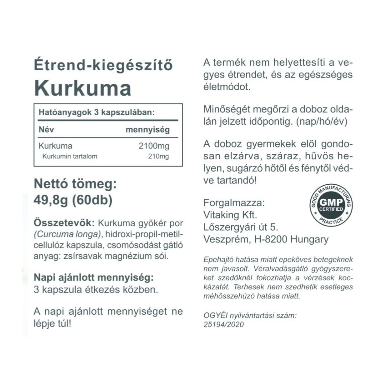 Összetevők : Kurkuma gyökér por (Curcuma longa), hidroxi-propil-metil-cellulóz kapszula, csomósodást gátló anyag: zsírsavak magnézium sói.