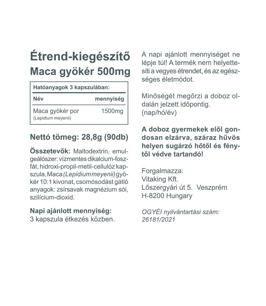Összetevők: Maltodextrin, emulgeálószer: vízmentes dikalcium-foszfát, hidroxi-propil-metil-cellulóz kapszula, Maca (Lepidium meyenii) gyökér 10:1 kivonat, csomósodást gátló anyagok: zsírsavak magnézium sói, szilícium-dioxid.