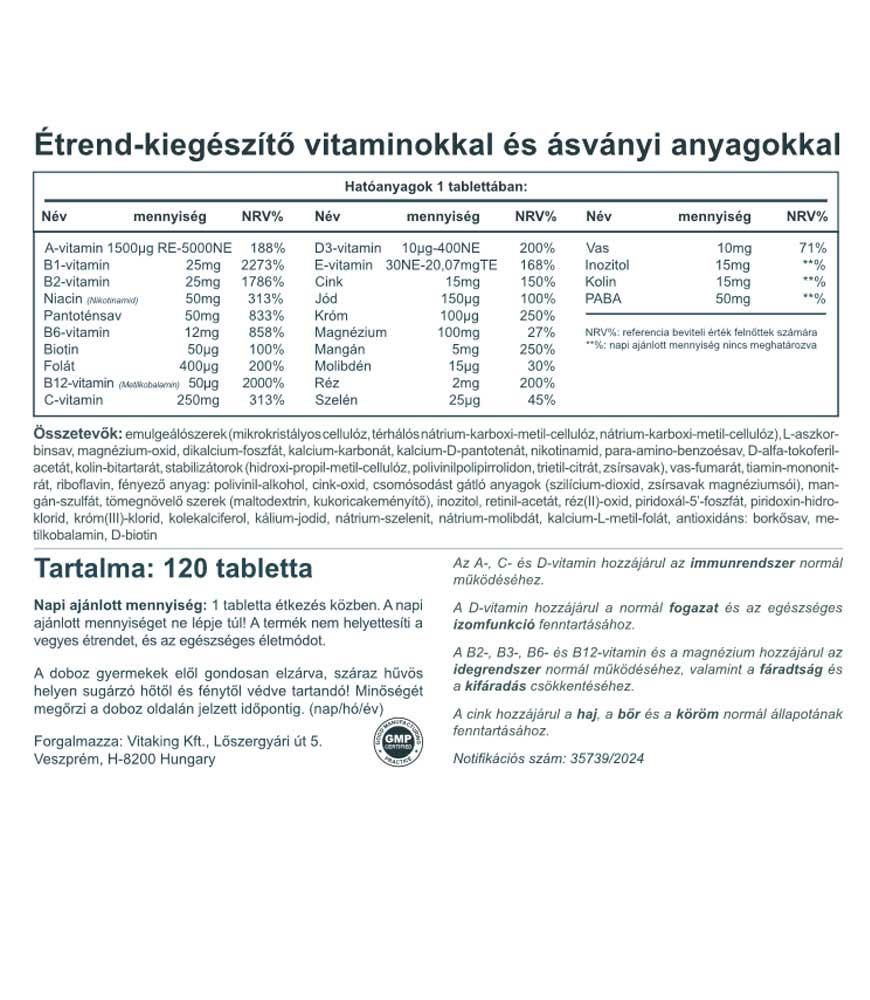 Napi egyetlen tabletta tartalmazza az összes szükséges vitamint és ásványi anyagot abban az alap mennyiségben, amel célszerú kiegészíteni az értendet!