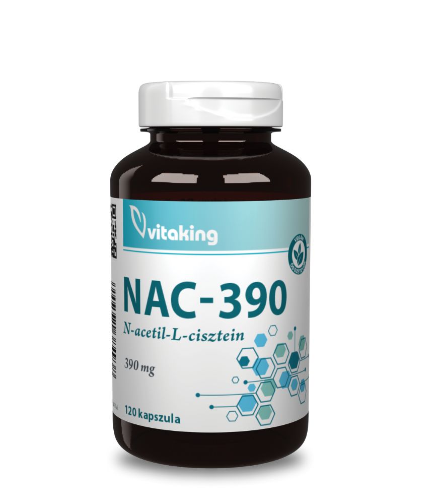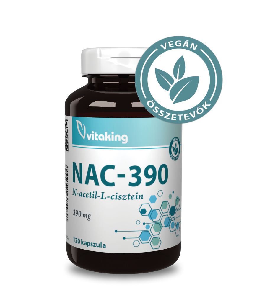Vitaking N-acetil-L-cisztein (NAC)  kapszulánként 390 mg hatóanyagtartalommal. A termék 100%-ban vegán, növényi kapszulahéjjal, és GMP-minősített üzemben készül, szigorú gyártási szabályozás mellett.