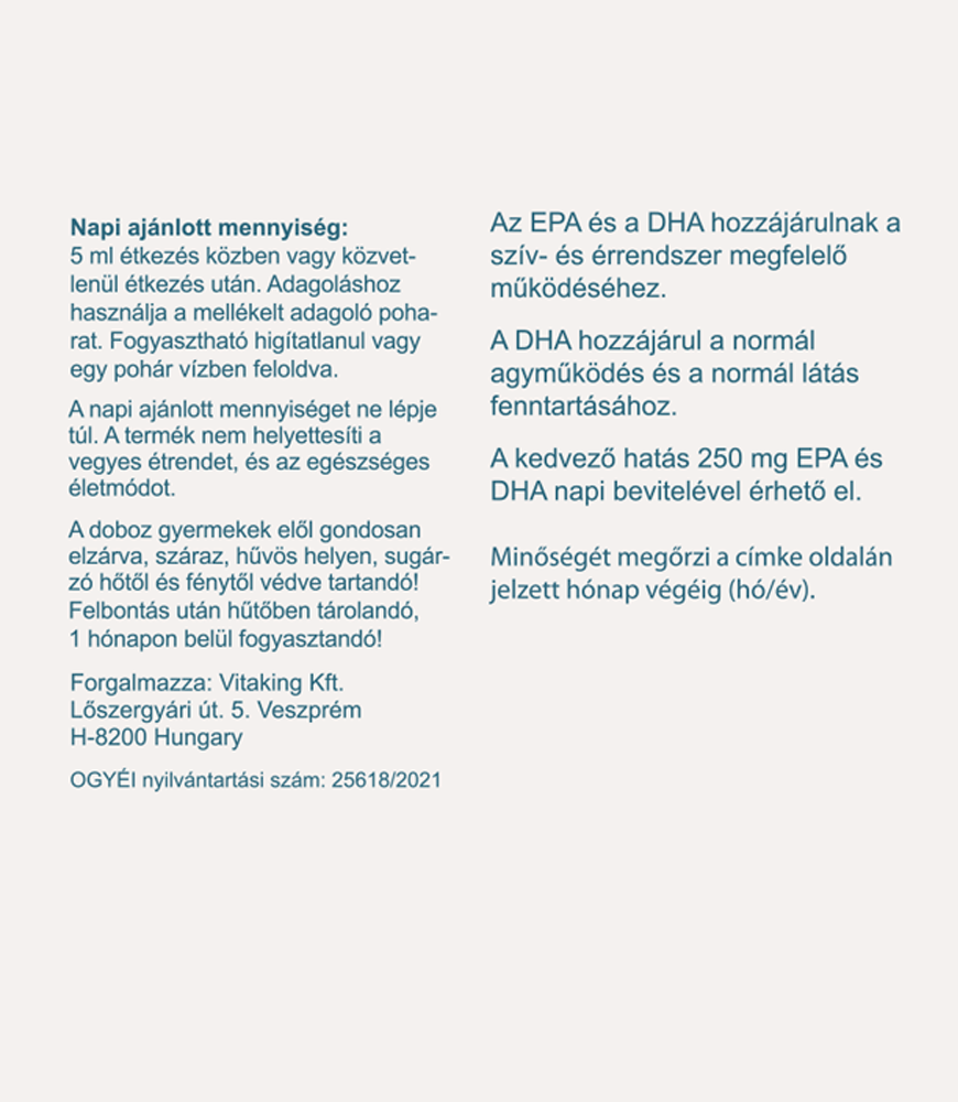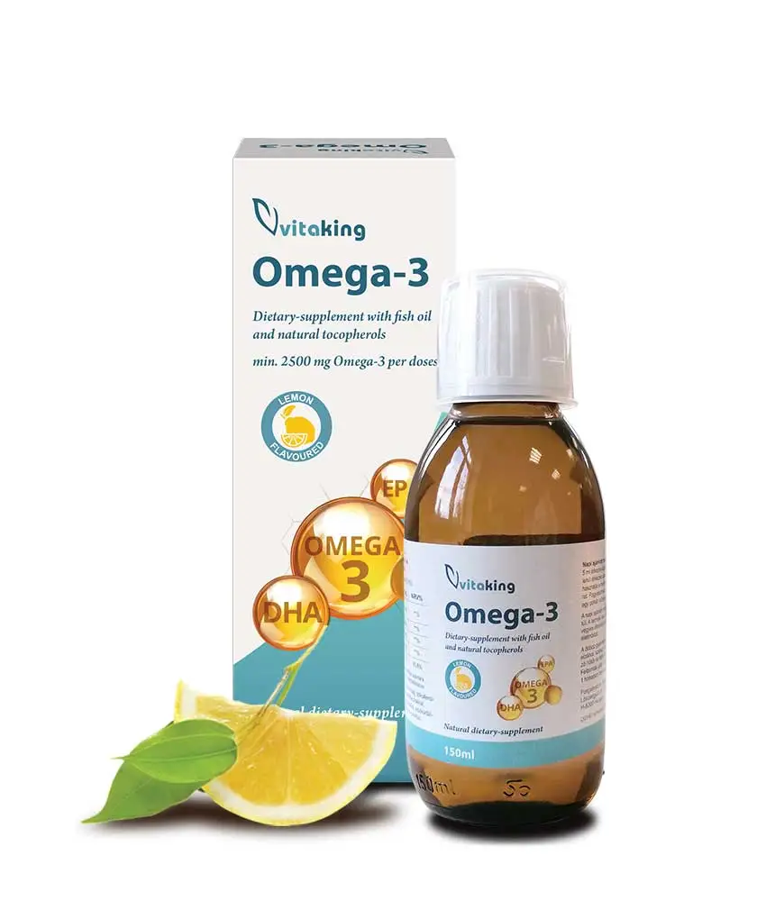 Vitaking Omega-3 olaj ( természetes triglicerid) 150ml-es kiszerelésben, tisztított halolajjal, citromolajjal, E-vitaminnal és rozmaring kivonattal. A termék finom citromos íze mellett a hal íze szinte alig érezhető. Kellemes aromája miatt bátran adható gyermekeknek is. Hatóanyag-tartalom egy napi adagban (5ml) min. 350mg EPA és min 2000mg DHA /napi adag.  A halolajban található EPA és DHA zsírsavak hozzájárulnak a szív megfelelő működésé­hez, a DHA hozzájárul a normál agymű­ködés  és normál látás fenntartásához.
