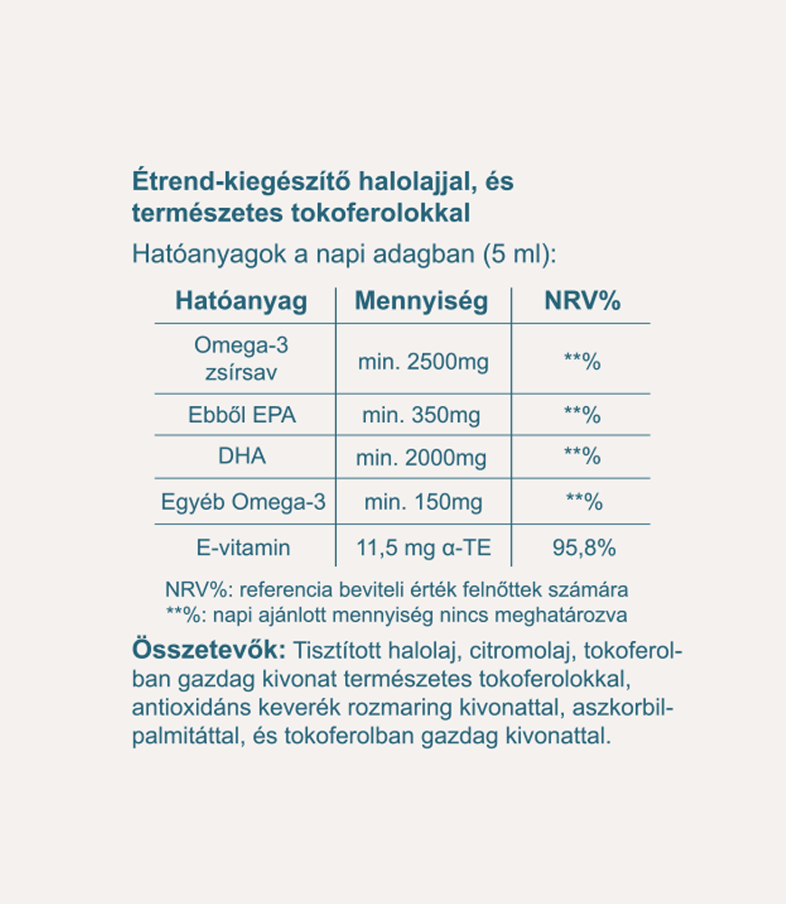 5ml-ben 2500mg Omega-3 van, ami egy átlag 70kg-os felnőtt adagja. Érdemes a gyereknél is testsúly alapján kiszámolni az adagot.
