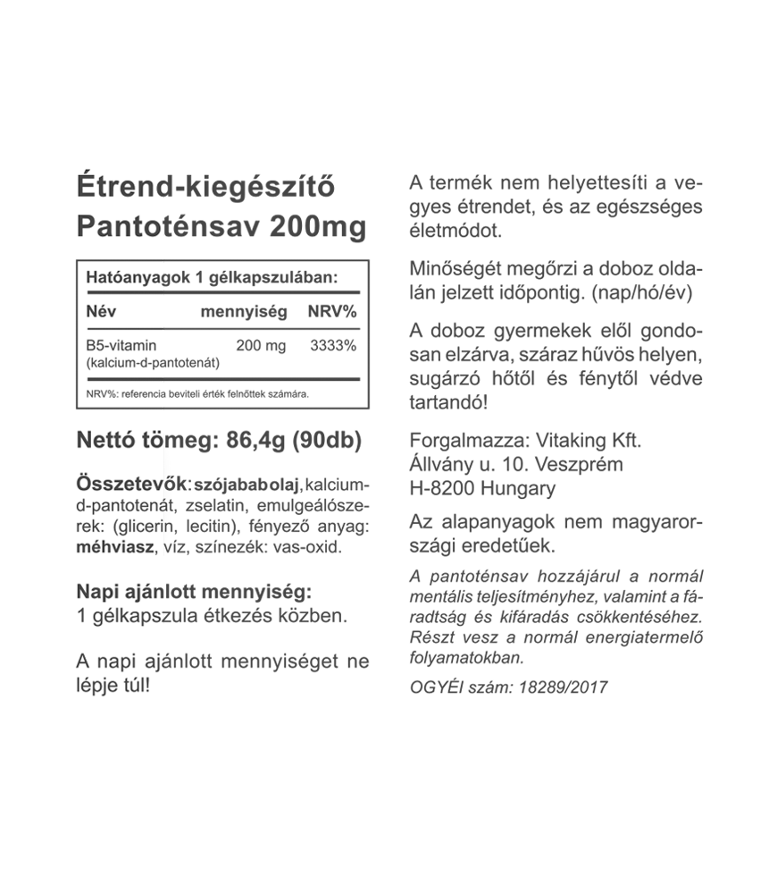 A B5-vitamin részt vesz a normál energiatermelő folyamatokban, hozzájárul a szteroidhormonok, a D-vitamin és egyes ingerületátvivő anyagok normál szintéziséhez és anyagcseréjéhez. Hozzájárul a fáradtság és a kifáradás csökkentéséhez, a normál mentális teljesítményhez és részt vesz a normál energiatermelő folyamatokban.