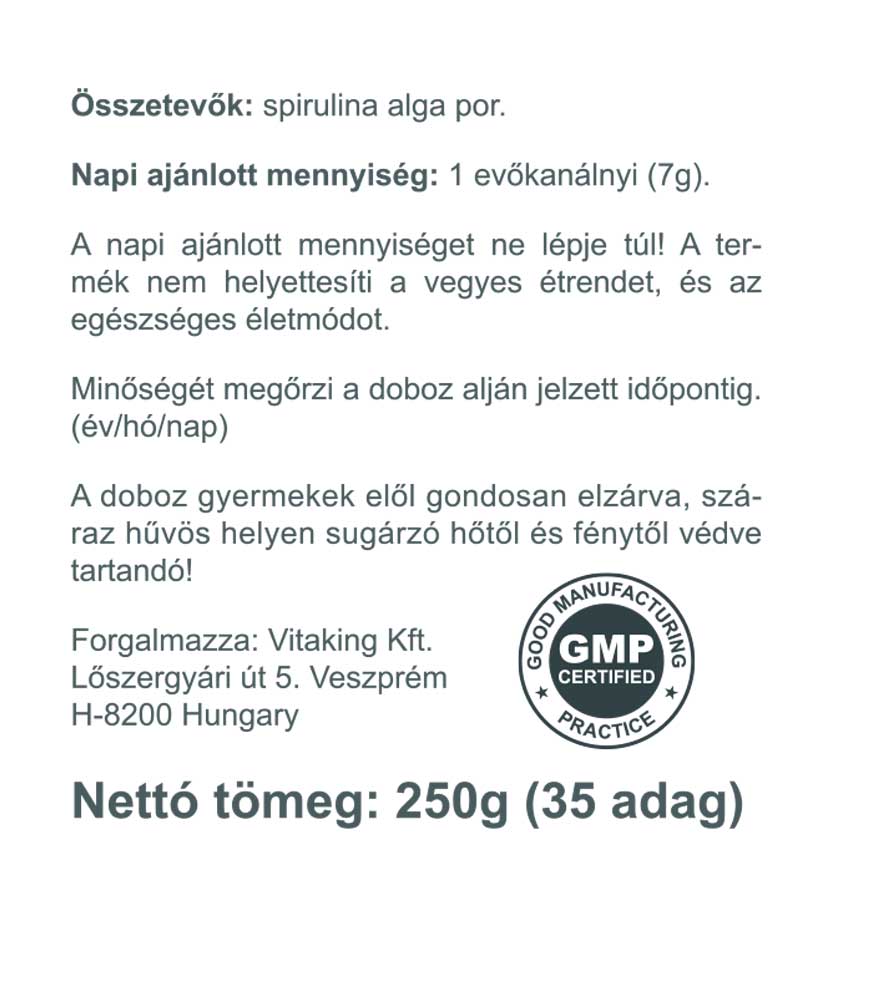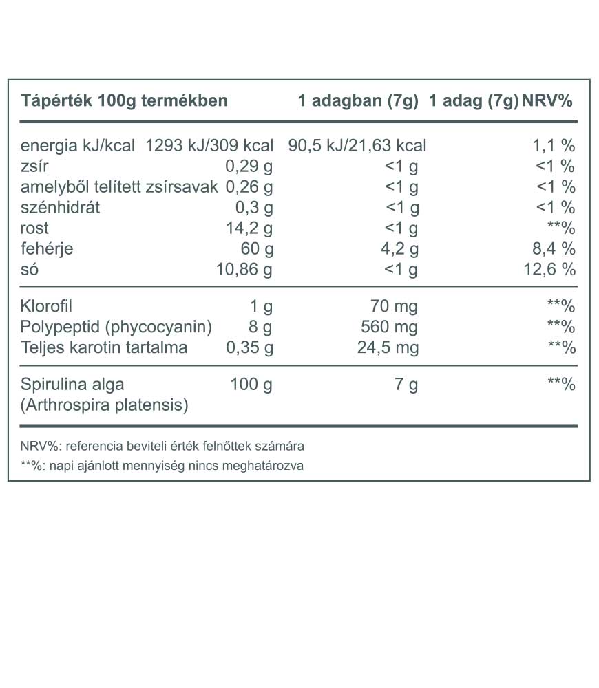 A Spirulina alga tökéletes összetételű tápanyag, több vitamint, enzimet(klorofill), ásványi anyagot és aminosavat tartalmaz, mint sok más élelmiszer, ezért használhatjuk táplálék-kiegészítőként.