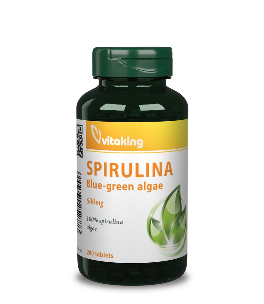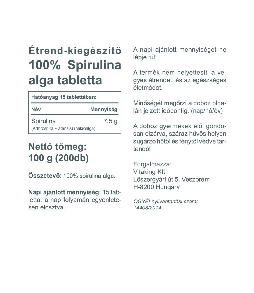 A Vitaking legtisztább organikus termelésű Spirulina alga tablettája nem tartalmaz semmi egyebet csak az algát. Különleges gyártástechnológiának köszönhetően semmiféle tablettagyártáshoz használt egyéb segédanyagot nem kellett használni. A termék alapanyagául szolgáló algát a német Ceres vizsgálja és minősíti.