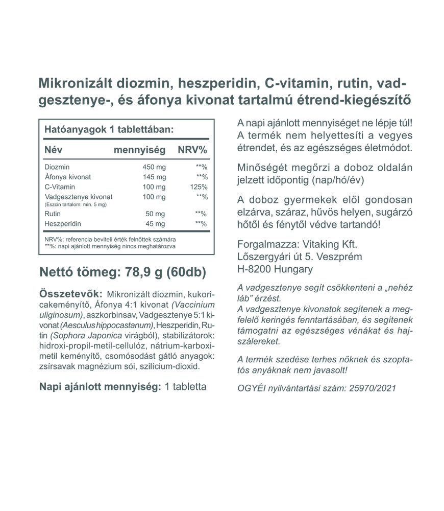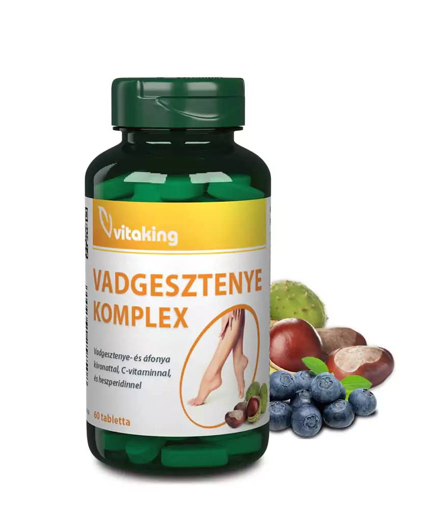 A Vitaking Vadgesztenye komplex áfonya kivonatot, diozmint, C-vitamint, vadgesztenye kivonatot és heszperidint tartalmazó készítmény. A vadgesztenye segít a „nehéz láb” érzésének csökkentésében. A vadgesztenye kivonatok segítenek a megfelelő keringés fenntartásában, és segítenek támogatni az egészséges vénákat és hajszálereket.