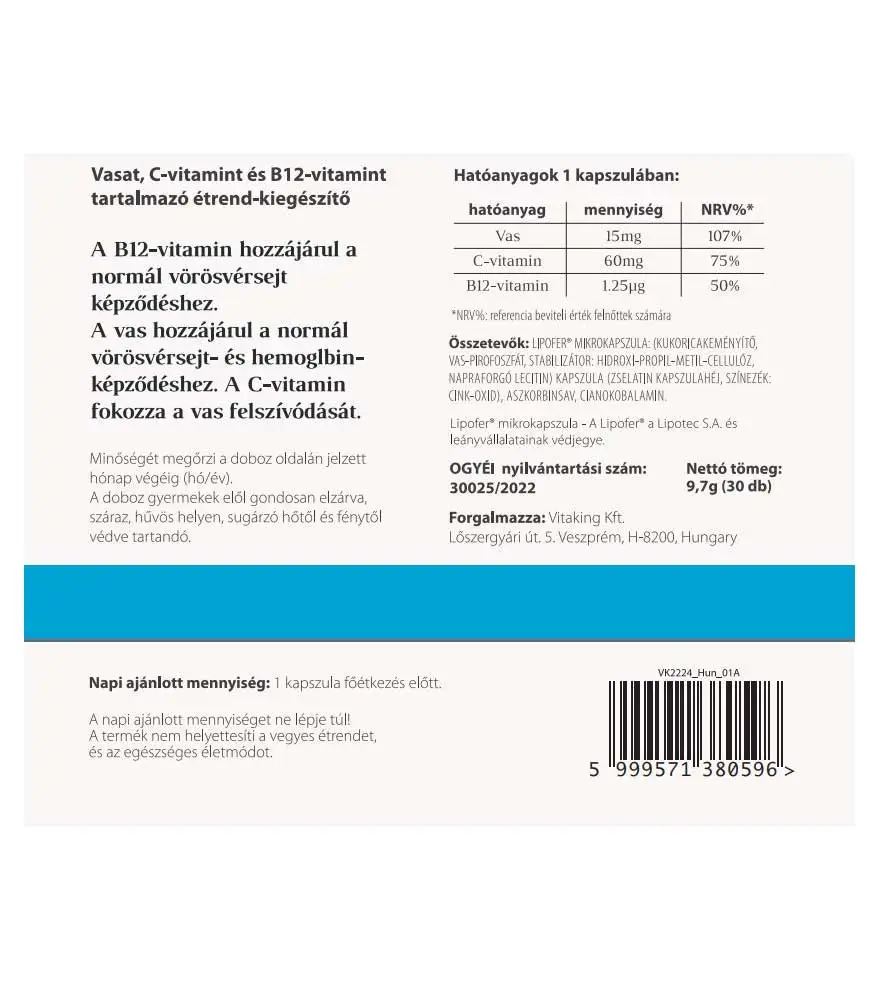 A VitaFer étrend kiegészítő a vason kívül tartalmaz még B-12- és C-vitamint is.