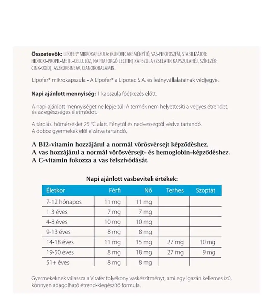 A VitaFer mikrokapszulás étrend-kiegészítő kitűnően alkalmas napi vas igény biztosítására. A vason kívül B12- és C-vitamint is tartalmaz. A vas hozzájárul a normál szellemi működés fenntartásához, a normál vörösvérsejt- és hemoglobin-képződéshez és részt vesz a normál energiatermelő anyagcsere folyamatokban.