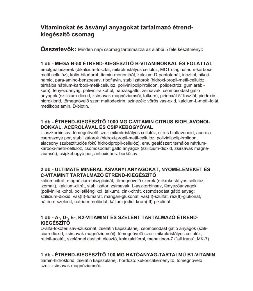 Minden doboz tartalmaz 30 kényelmesen hordozható csomagot, ami minden létfontosságú vitamint és ásványi anyagot tartalmaz a lehető legtermészetesebb formában. Minden napi multivitamin csomag tartalmazza az alábbi 5 féle készítményt: