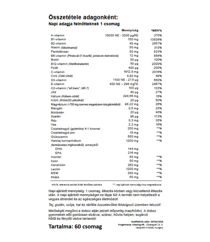 A vitaminok és ásványi anyagok mellett továbbra is minden napi adagban megtalálható Omega-3 természetes triglicerid halolajból, Lecitin, Glükozamin, Kondroitin, Csipkebogyó és MSM, hogy átfogó támogatást nyújtson a fizikai megterheléssel járó napokon.