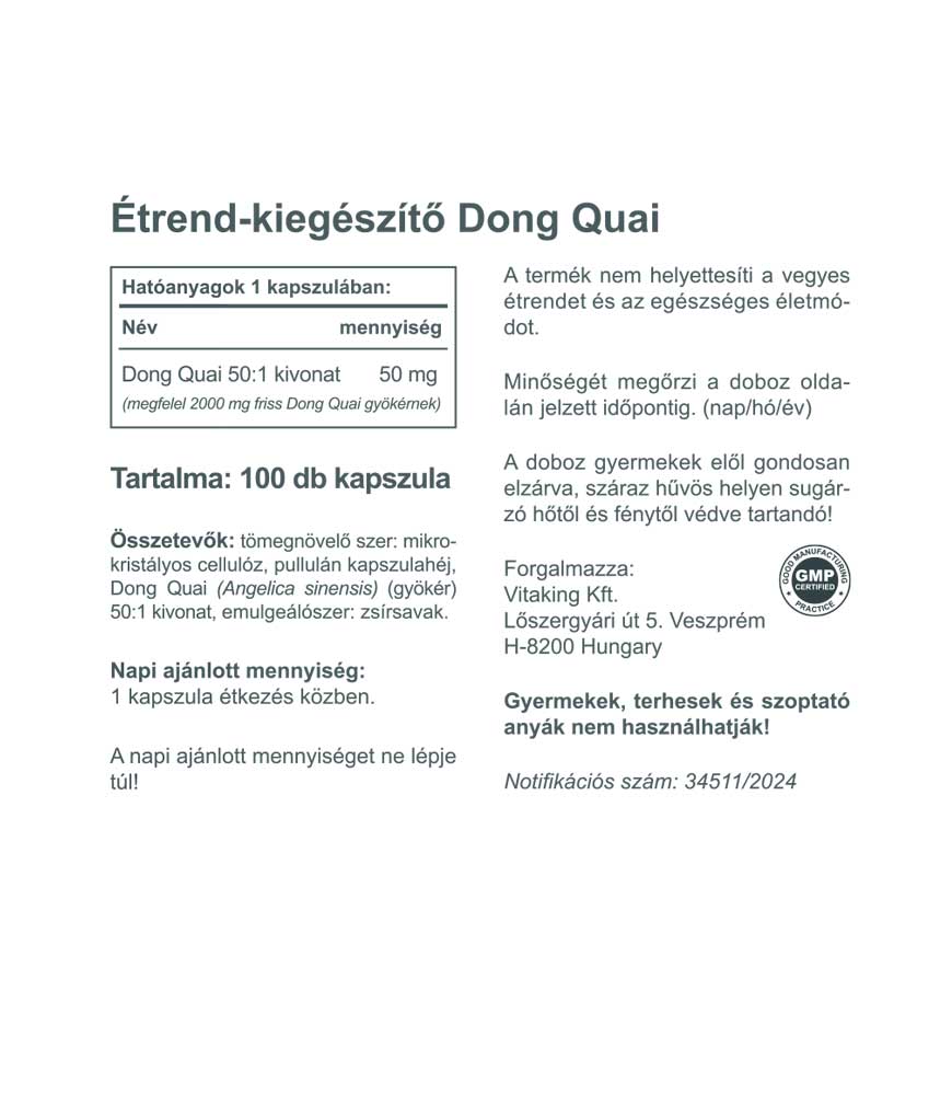 Válaszd a minőséget és magas hatóanyag tartalmat! Termékünk 50mg Dong Quai (50:1) kivonatot tartalmaz kapszulánként, ami megfelel 2000mg friss Dong Quai gyökérnek!