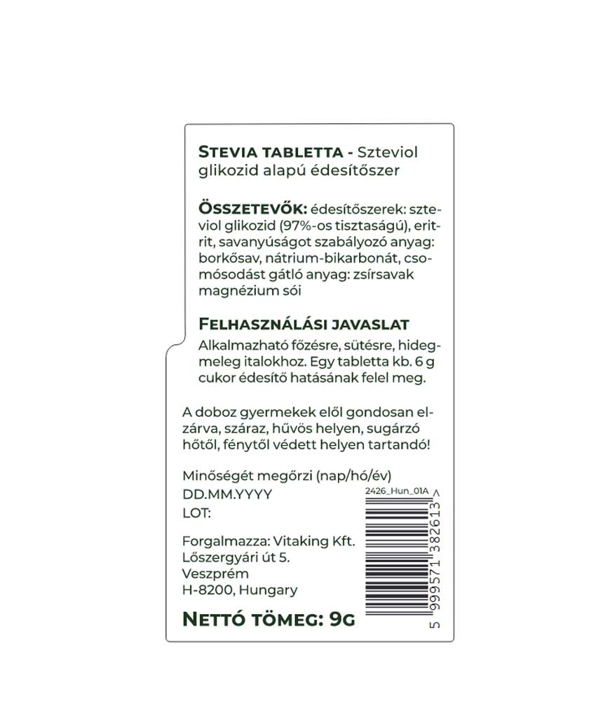 A stevia tabletta szteviol glikozid (a stevia édes ízét adó növényi vegyület) alapú asztali édesítőszer.