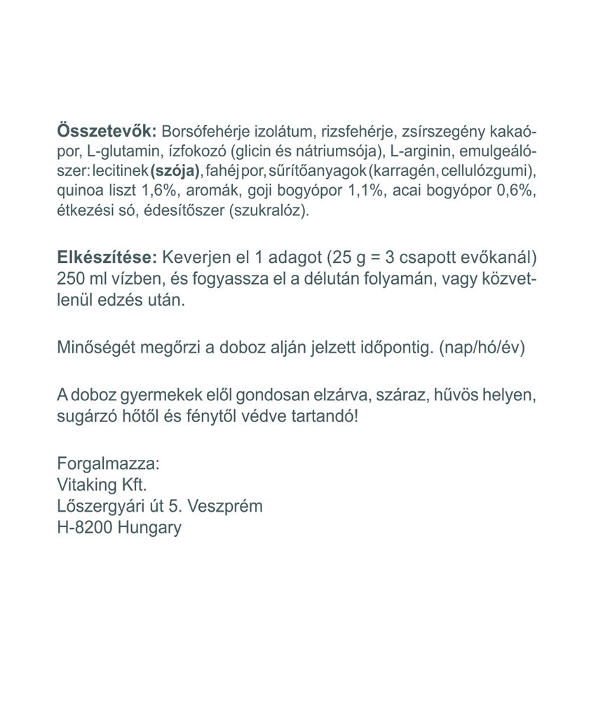 A Vitaking Vegán Protein egy különleges , növényi fehérje komplex (borsó és rizs) gojibogyó- és acaibogyó-porral, quinoa liszttel és édesítőszerekkel.